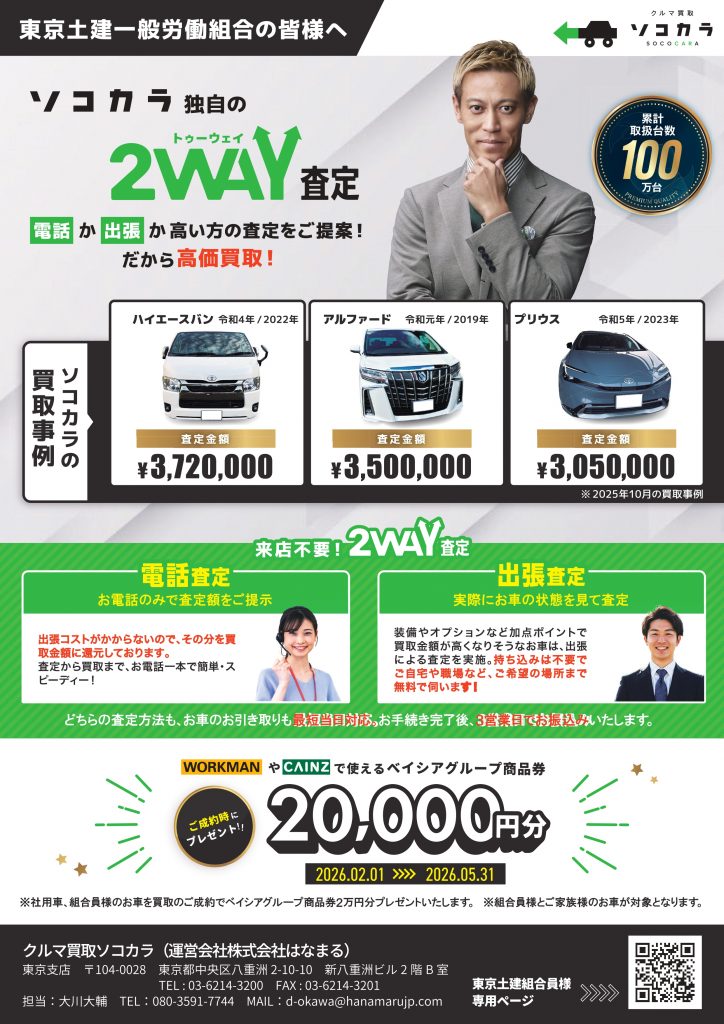 クルマ買取業者ソコカラより、東京土建組合員限定の特別優待のご案内です。マイカーはもちろん社用車